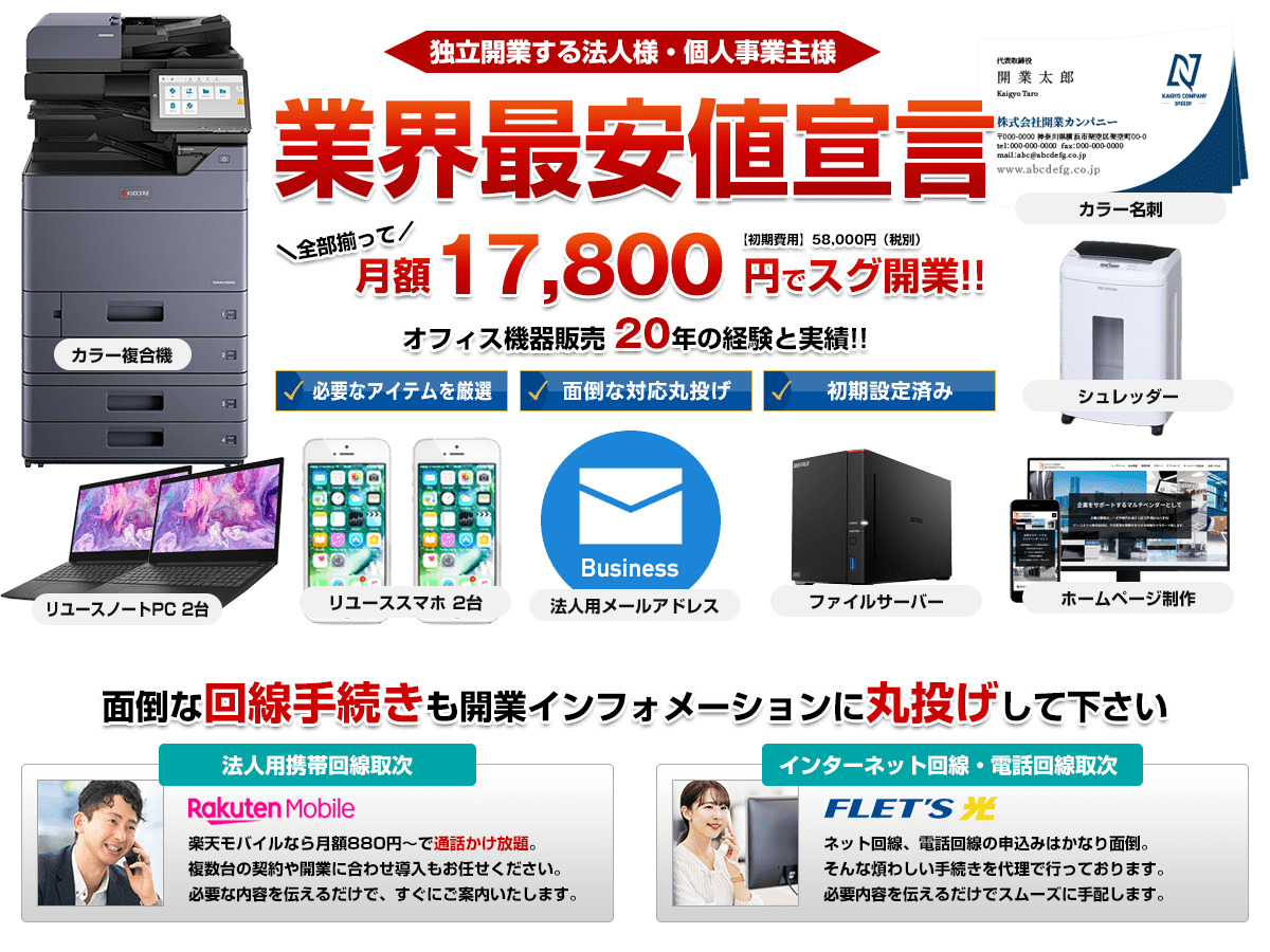 すべてワンパックに! - 複合機・パソコン・スマホ・法人用メール・名刺まで、開業に不可欠なアイテムを一括提供。
